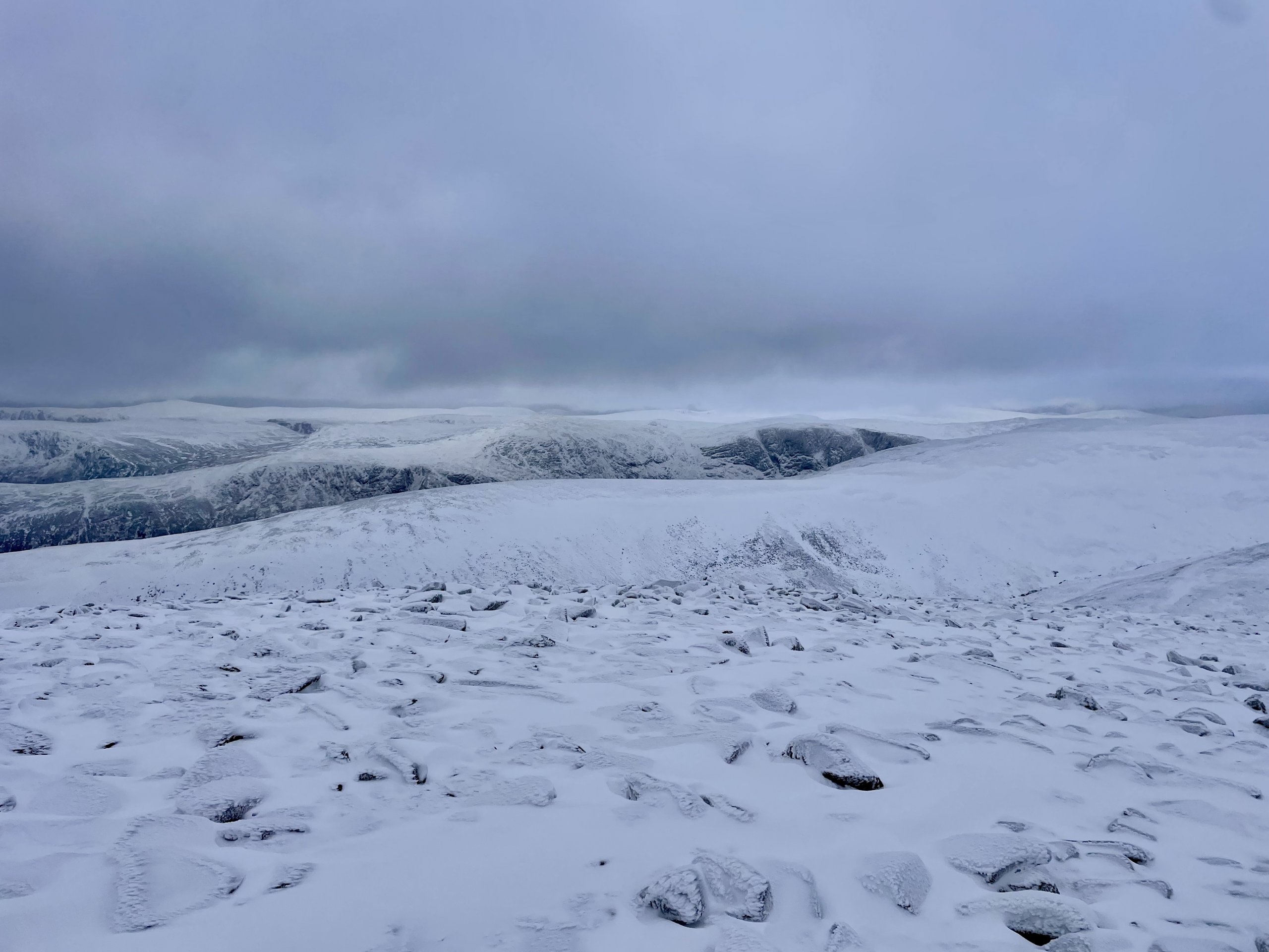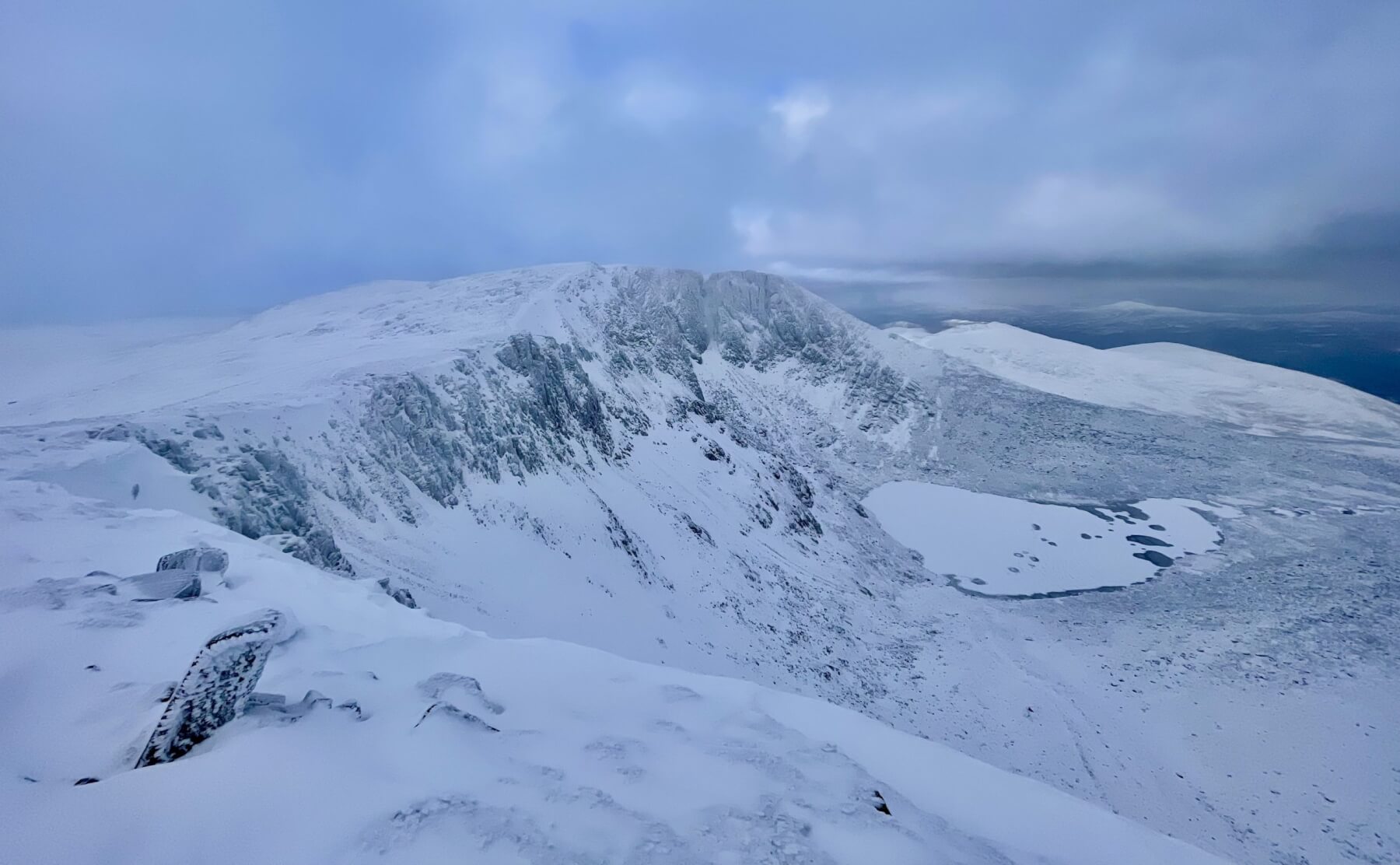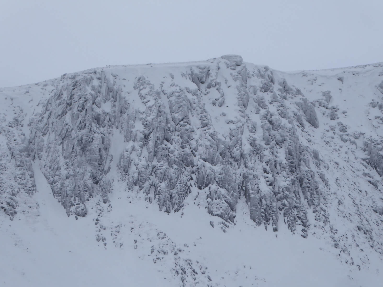 Having been stuck in the cloud the past views days, Lochnagar made her presence felt today. A relatively calm and cold day yielding much more favourable conditions for higher level observations and photos. The existing windslab is slowly consolidating with instabilities remaining on West and North-West aspects above 900 metres. Away from these aspects and where exposed to the wind, conditions underfoot are rather favourable. Not much change expected for the next 48 hours so if it’s pea soup tomorrow, you have a good baseline to work from now.