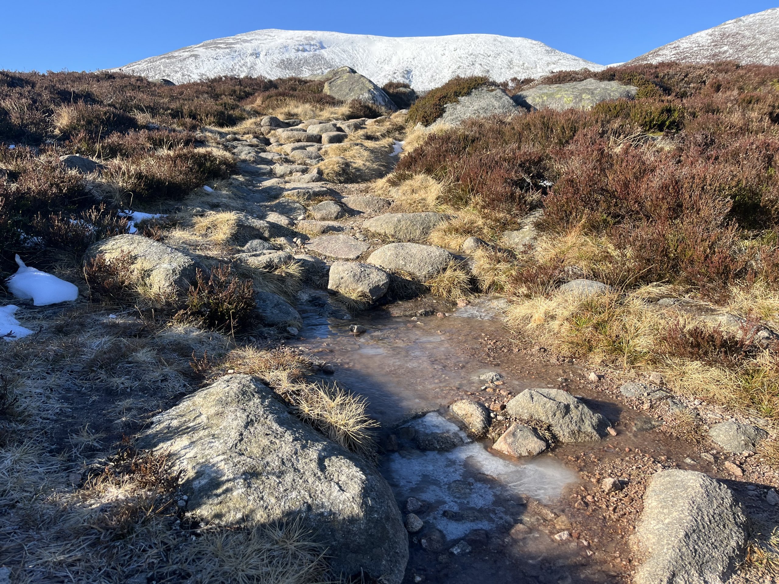 (Above) The path was void of snow below around 800 metres, although there were small patches of water ice to look out for.