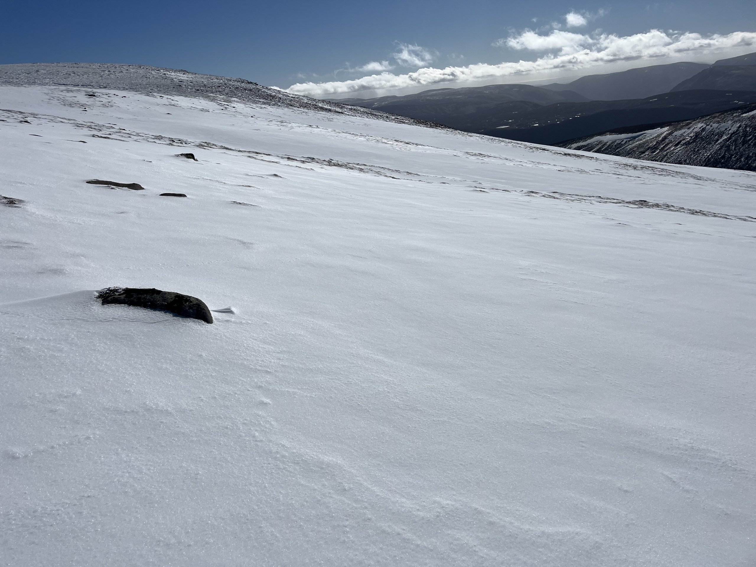 (Above) This is one of the more recently developed larger snow patches on a Southerly aspect above 1000 metres. A breakable crust made travel quite tiring.