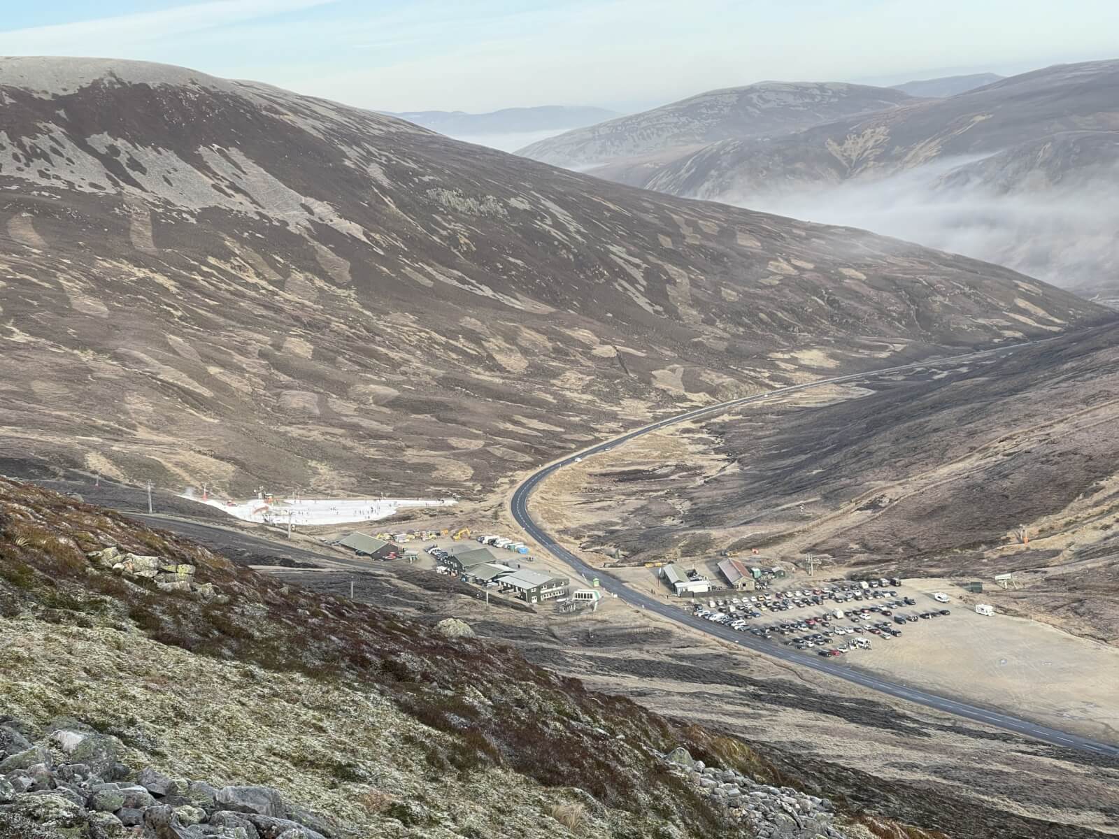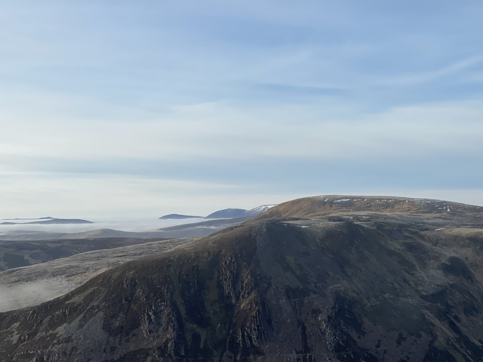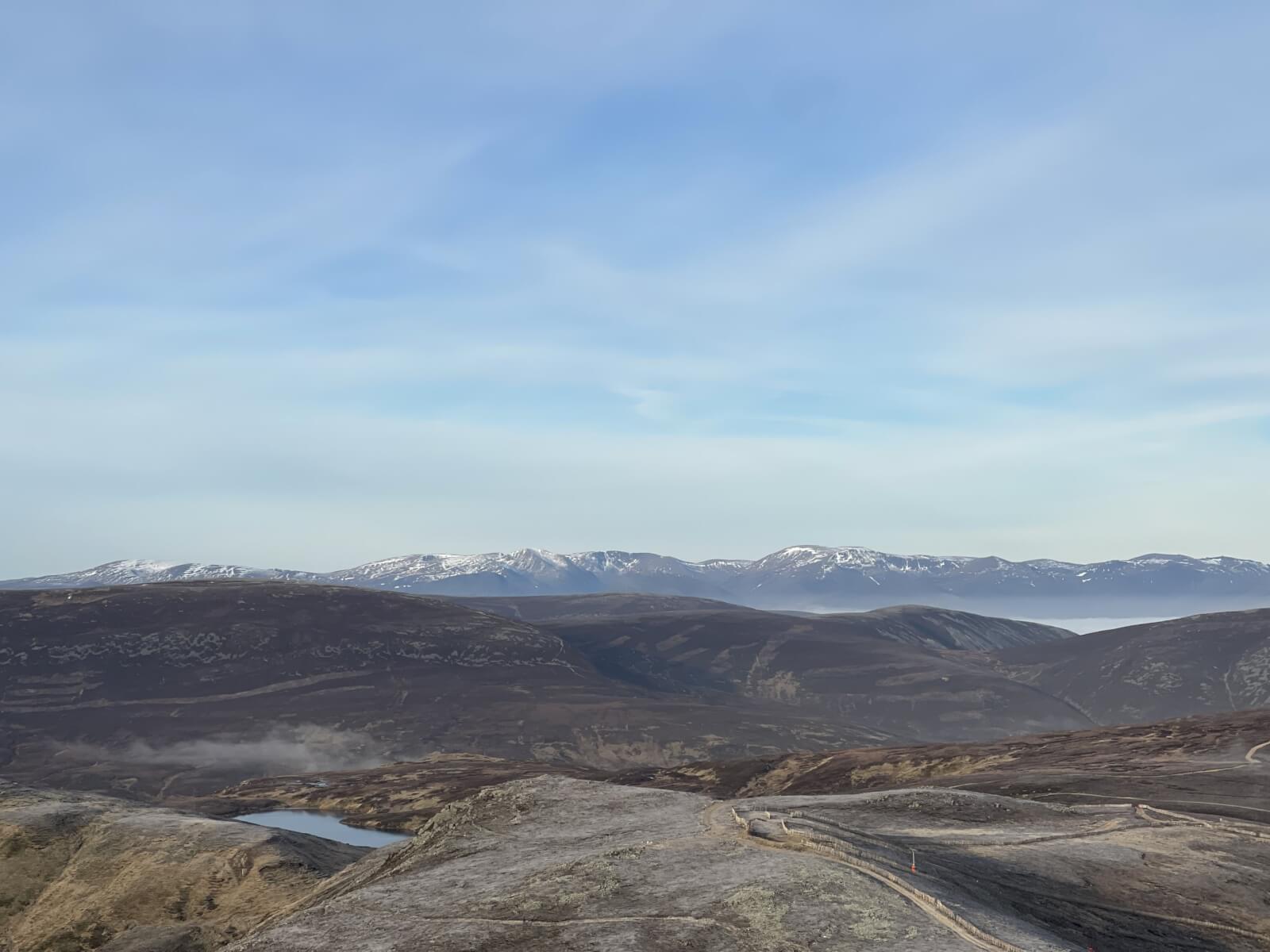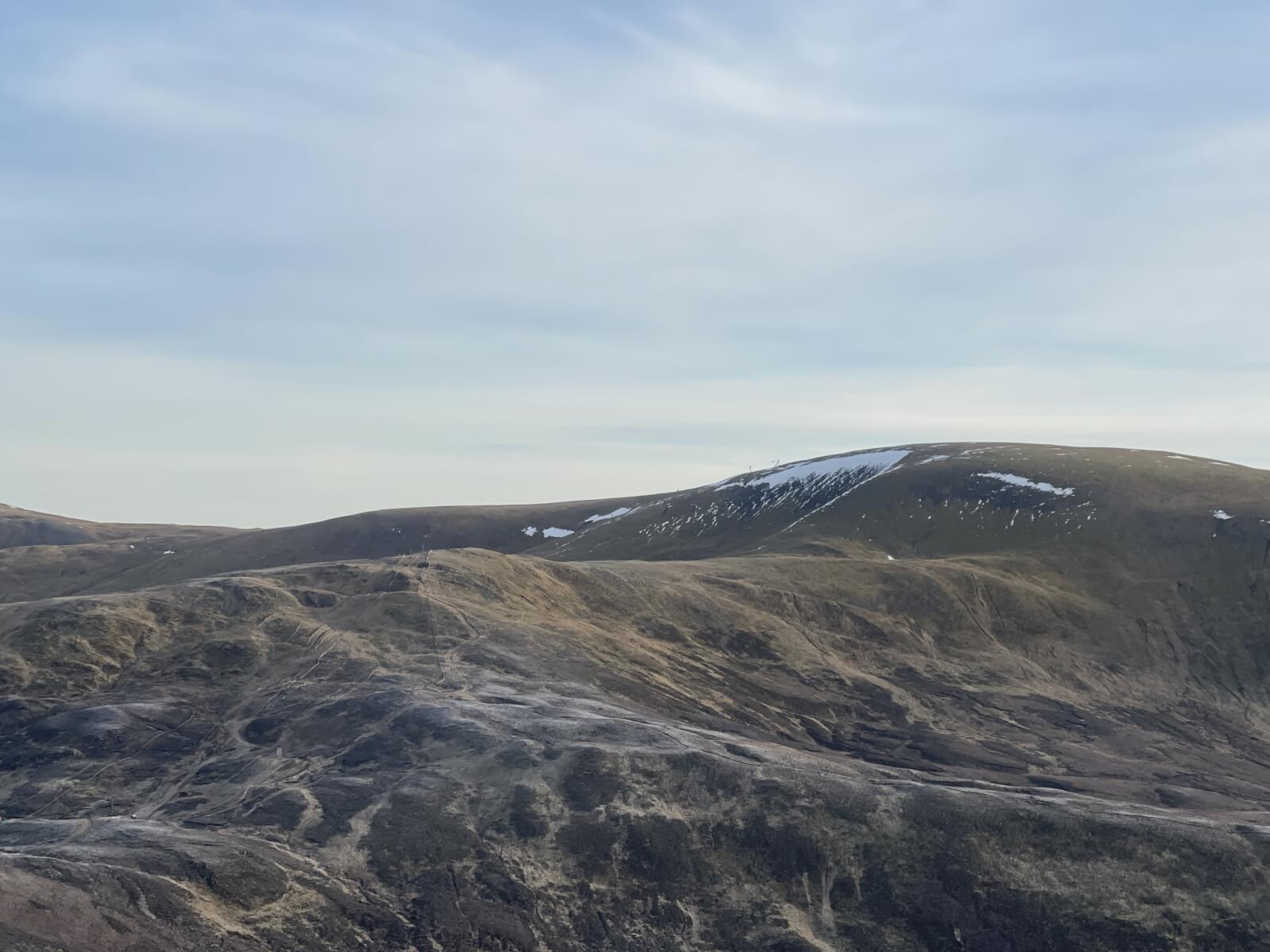 Driving along the A93 today it was hard to keep the faith – thick cloud covered the area and it was cold and damp. Just as we climbed up to the Glenshee Ski Centre, the cloud started to thin and we broke out into blue sky and sunshine. Very light winds made for a calm and pleasant day to be out. The lower hills south of the River Dee have no or very small areas of snow and it is generally only the 1000 metre plus summits that have any. No change expected in the next couple of days.