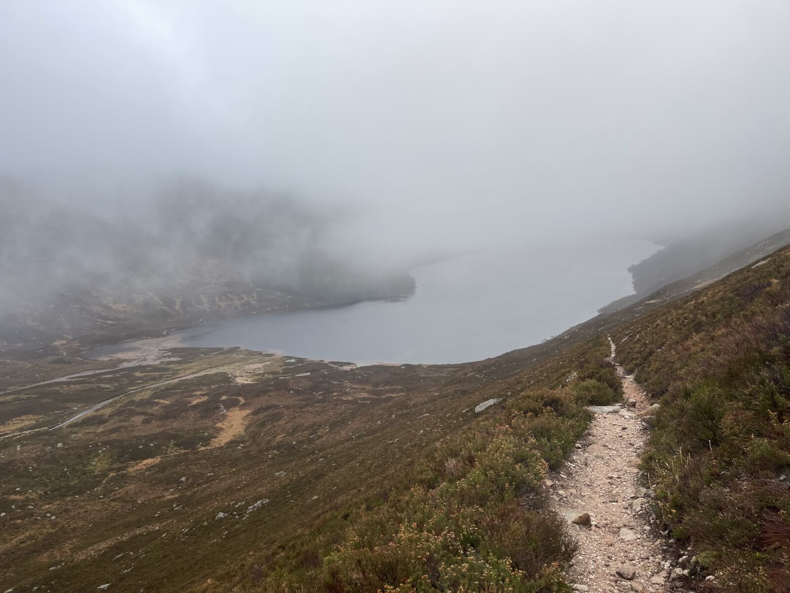 Icy conditions first thing with patches of water-ice and ice glazed rocks from glen level. Thick bands of cloud gave damp conditions and very poor visibility at the summit of Broad Cairn (998m). There was a strong, cold NE wind which was great for keeping you moving – not much sitting around today! Only small shallow patches of snow on Broad Cairn but the summit boulder field was a bit slippery. No real change for tomorrow – dry conditions with a temperature inversion. Winds will become light, variable  – so more pleasant than today. Photo opportunities were very limited today.