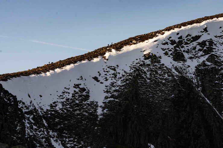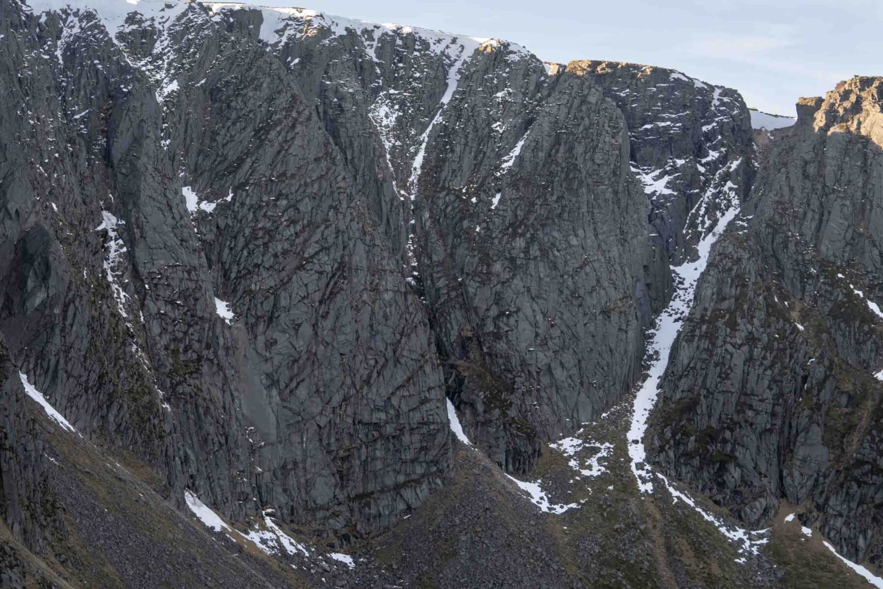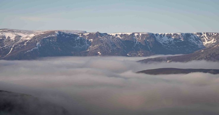 It was a cloudy start around the glens this morning. But the patchy cloud did start to break up, particularly as you climbed higher. Most of the higher tops bathed in sun and slightly warmer temperatures.  Gullies and corrie rims are just about hanging onto snow, little elsewhere. Quite a few people around, enjoying the benign conditions.