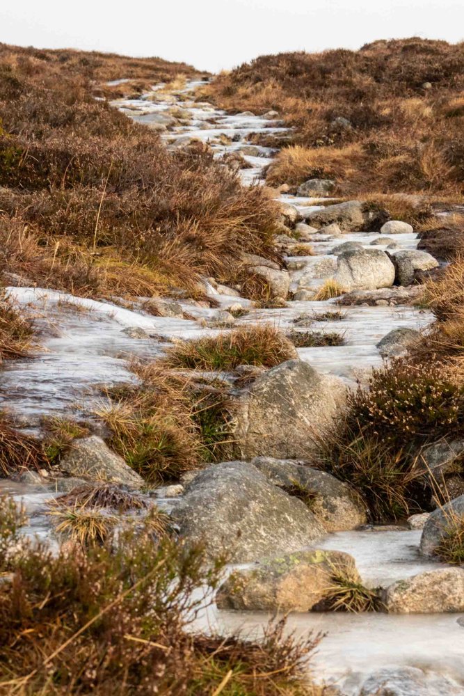 Very icy on the footpaths with shallow burns well frozen. Around -2 overnight at 900 metres, -1 during the day.