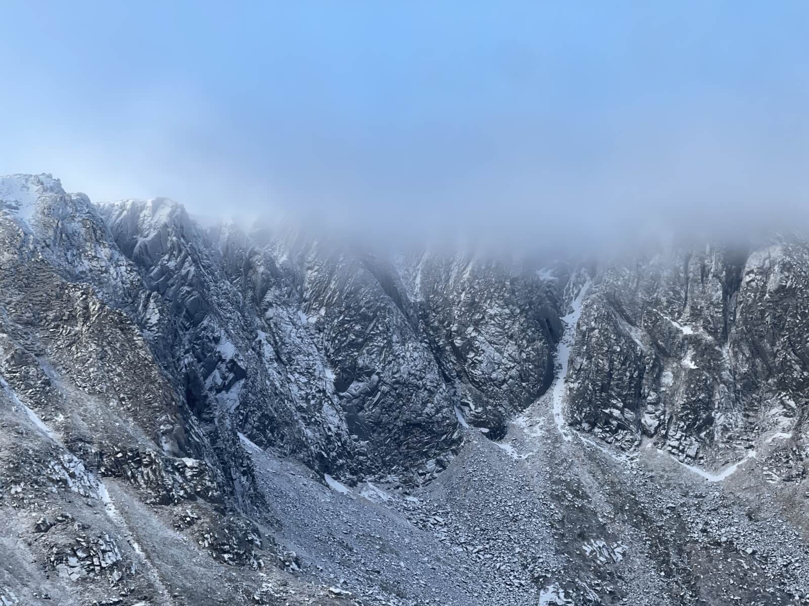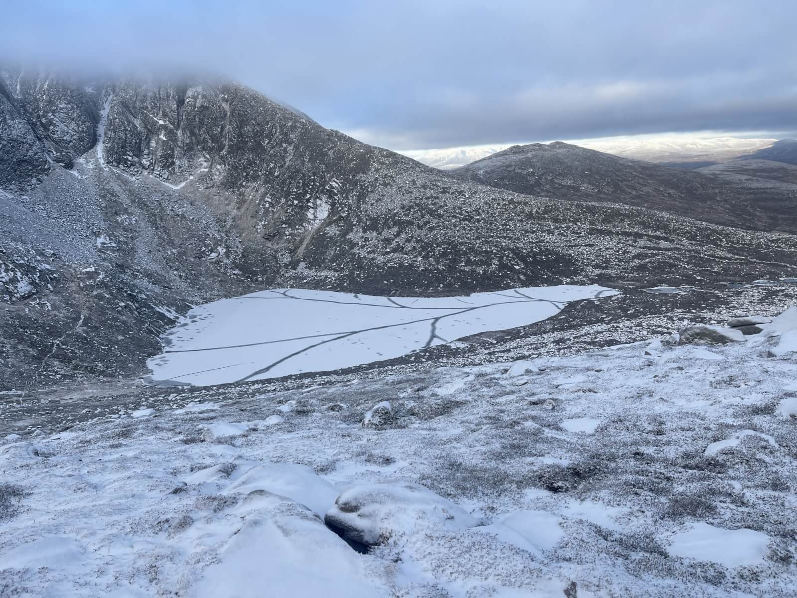 A much better day with the cloud clearing to allow a blue sky view and some sunshine – which was very much needed as it was bitterly cold first thing. Many paths have water-ice on them or ice glazed rocks. There has been a trace of new snow above 600 metres giving the hills a more wintery appearance. The weather is now slowly starting to change with the high pressure system slipping South allowing an Arctic Maritime airmass to take its place. A Met Office yellow weather warning for snow is in place for the area from 06:00 hrs on the 1st January.