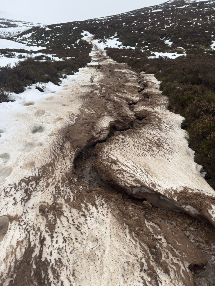 The main track to the corrie has still got plenty of snow. Quite slow going in places, expected to become much firmer, particularly at higher elevations.