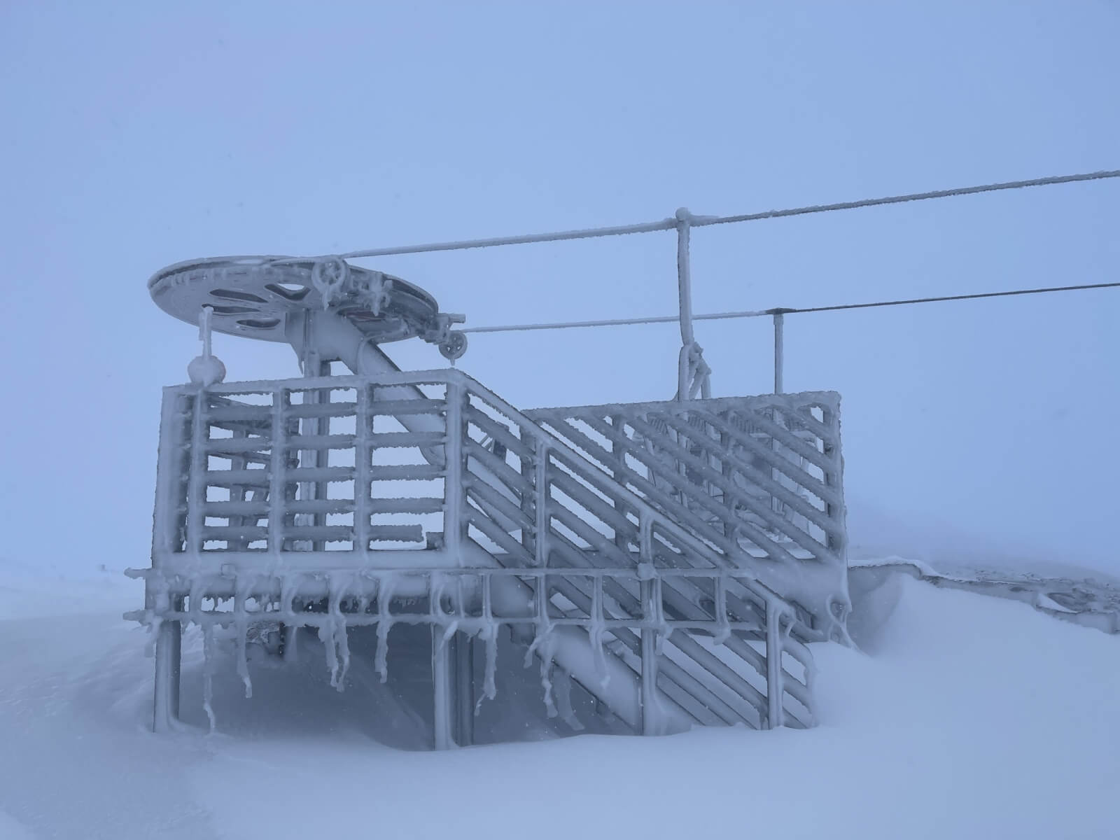 This is the weather system that just keeps giving…. Precipitation throughout the past 24 hours with wet snow at 600 metres, drier above 800 metres. Persistent drifting of deposits above 800 metres with some large drifts in wind sheltered locations and lots of wind ridges to trip over in the poor visibility. It was full on winter conditions today – with goggles on when you were walking into the wind – as the snow just kept blowing. There are also some very icy slopes that have been scoured by the strong winds – crampons were essential for making any progress. Fragile cornices have formed and are easily failing under body weight.