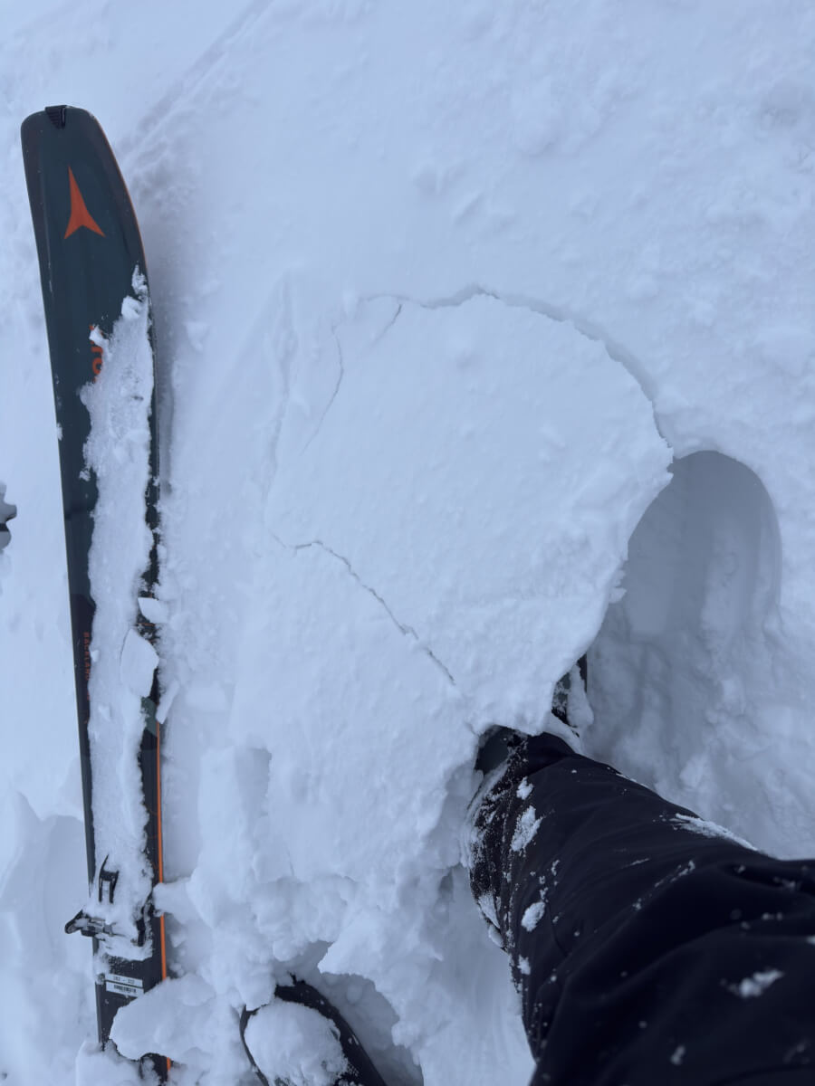 New unstable windslab forming on a Westerly aspect. There was some consolidation of earlier deposits that were subject to a brief thaw, the snow below this was now holding my weight well, good job as it was over 3 metres deep!