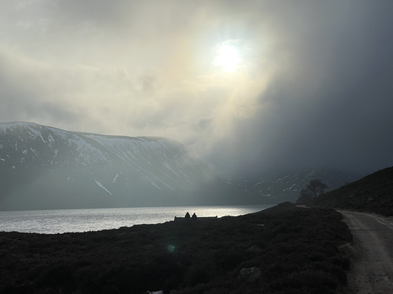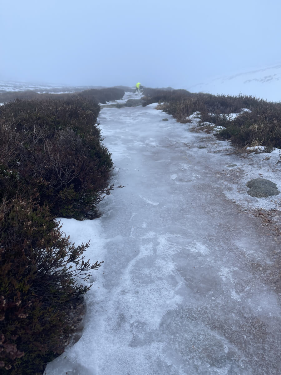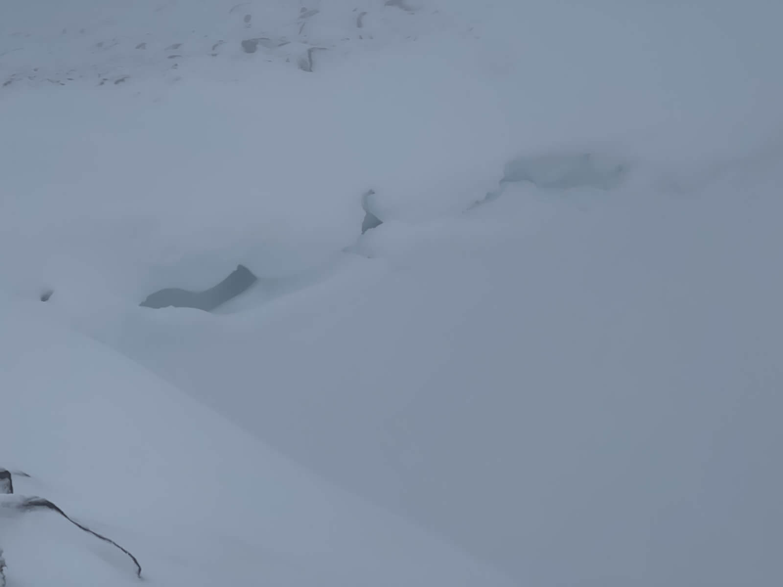 No visibility on Lochnagar today – the cloud base dropped below 700 metres at times today. Despite being a generally Southerly wind, it felt pretty chilly up there. Underfoot conditions were firm first thing with patches of water-ice and snow-ice from below 600 metres. Yesterday’s wet snow has started to consolidate, with cooler temperatures overnight giving it a thin crust. The fluctuating temperature theme will continue through the next 24 hour period with a 750 metre freezing level overnight, followed by a gradual rise up to 1100 metres by mid afternoon.