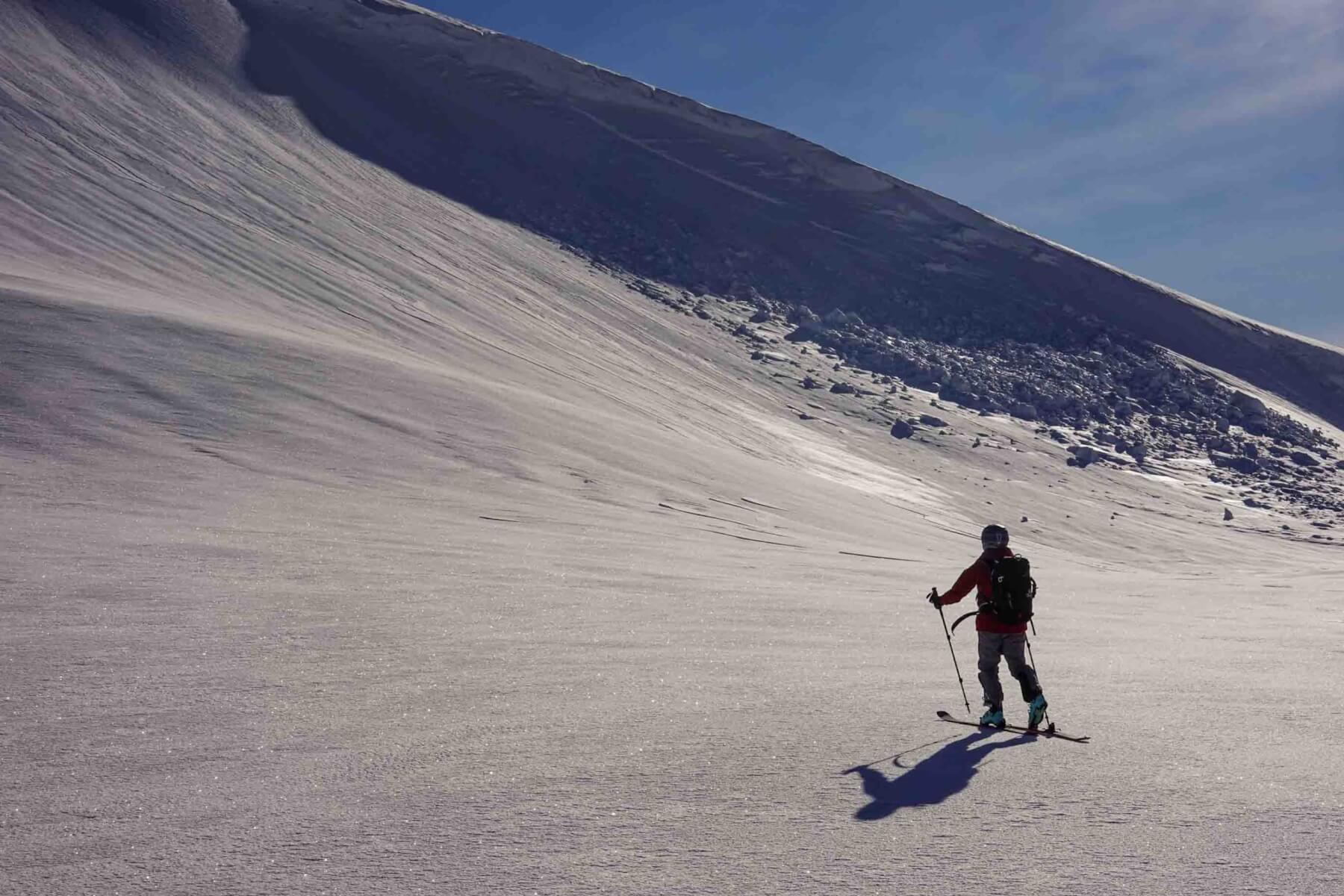 Generally very icy underfoot with ski or boot crampons useful for steeper ascents.