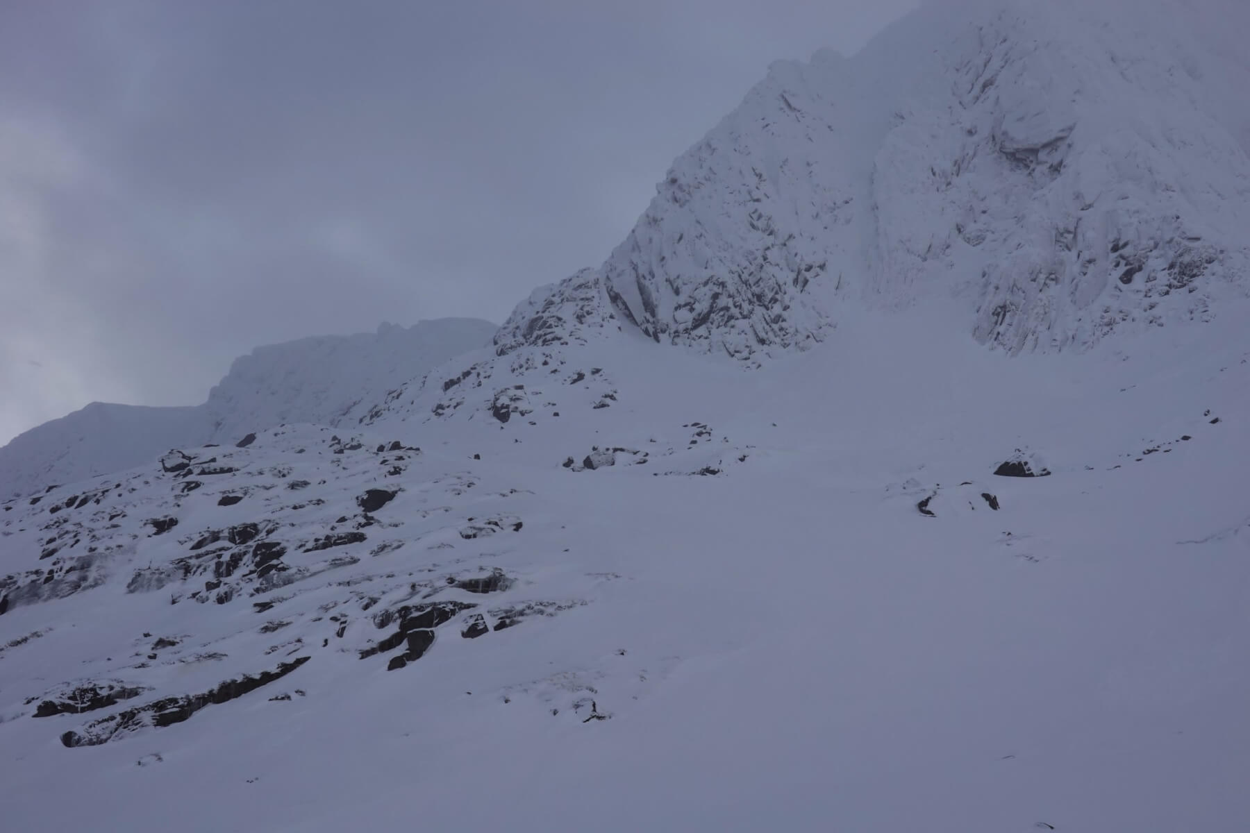 I had a ski in to Lochnagar today. It started as a bright day, but sadly clouds rolled in over the hills by lunchtime. Strong winds and snowfall followed. There is some debris around the crags, mostly from the West and Southern Sector areas. The biggest was noted over a week or so ago, but there have been other avalanches since then.