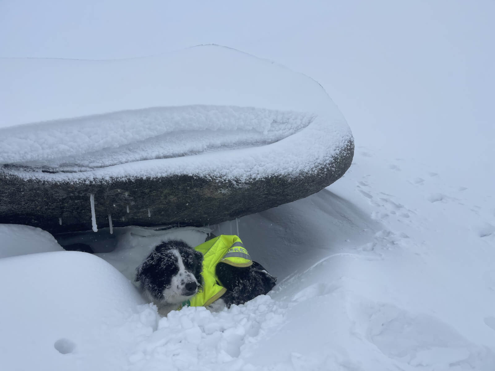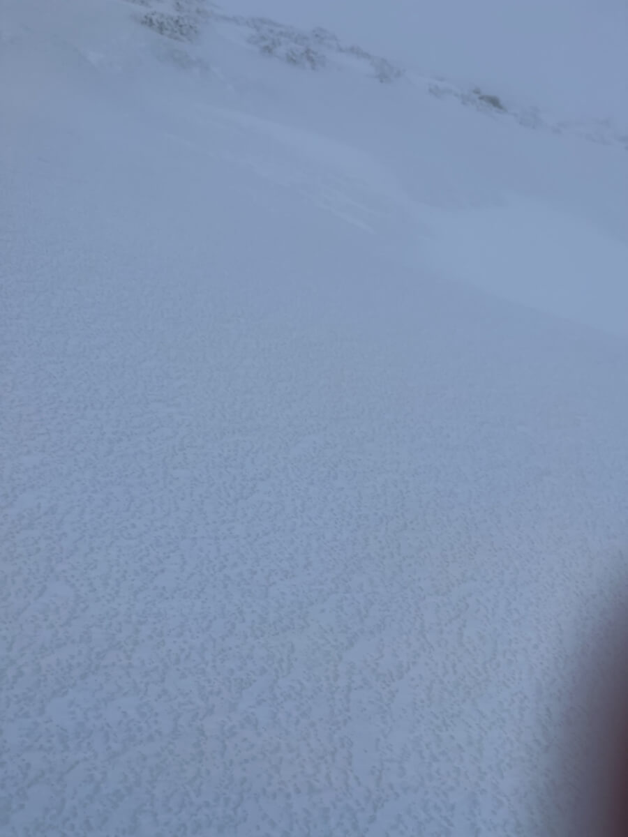 Good to have the freezing level lowering back down again – always sad to see the snow heading off down The Dee! The visibility was truly appalling today with the cloud right down in the lower hills. With the snow cover that we have on the higher hills, this meant that the only relief was the occasional large boulder appearing out of the gloom. The snow low down is still wet and has yet to re-freeze meaning that travel is pretty tiring. As you get higher there is a bit of a crust – which sometimes takes your weight, and often doesn’t! Above 800m things started to improve with firm wind scoured snow on exposed slopes. However as soon as you move onto wind sheltered slopes, drifted deposits are forming dry windslab, with lots of tell-tale cracking occurring around your boots.