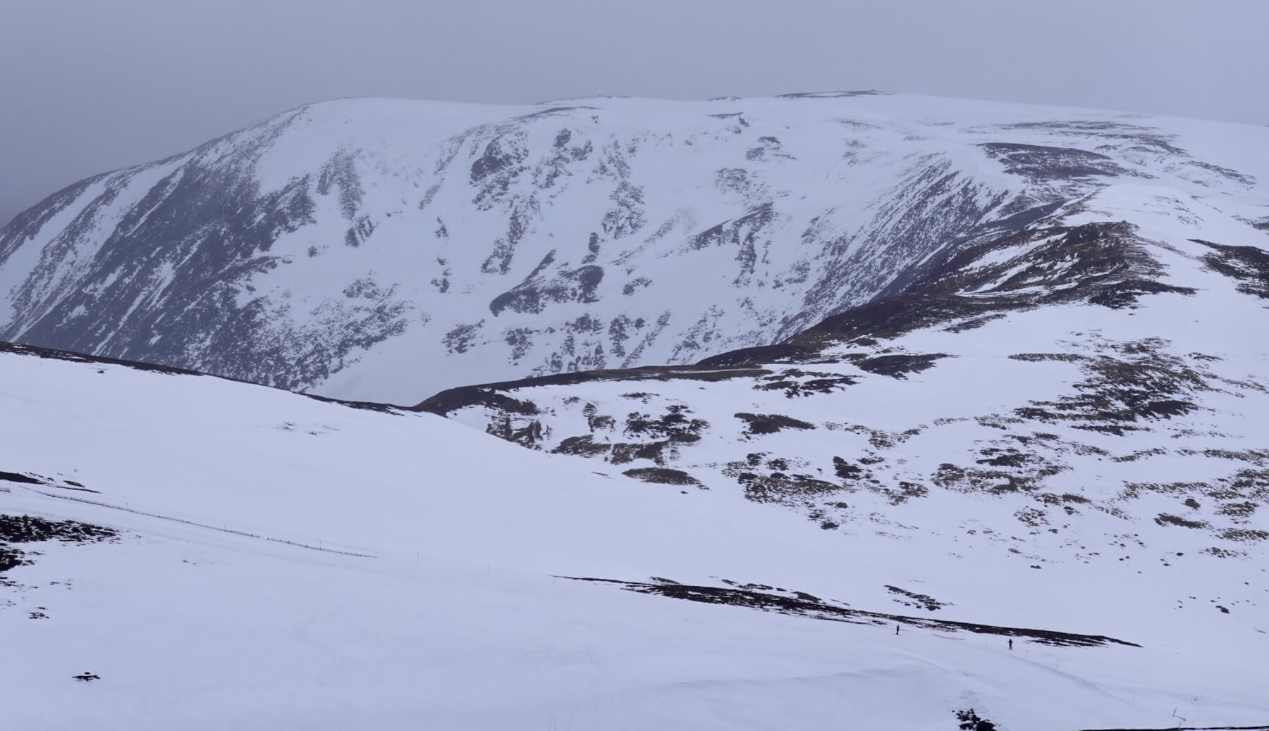 Looking towards Carn Nan Sac (920 metres). The North-East face holding snow well. Note- the skiers down right are on ‘The Bunny Run’, a piste at Glenshee Ski Centre.