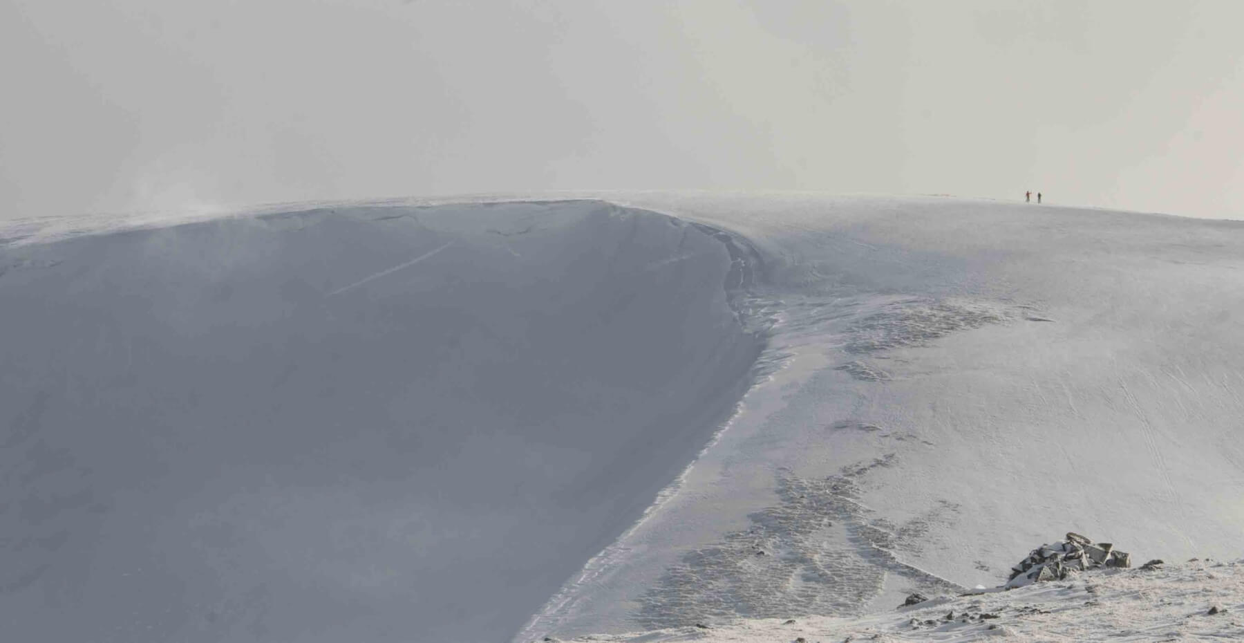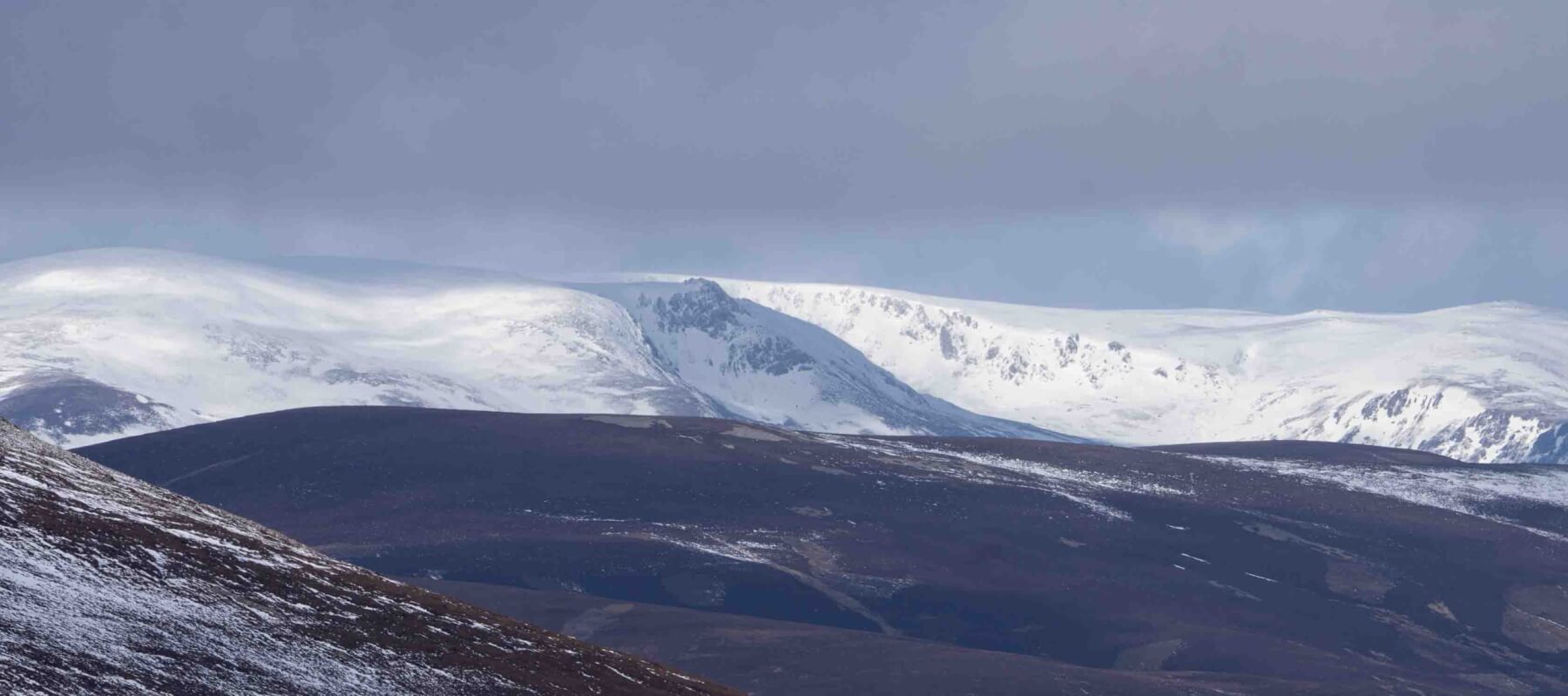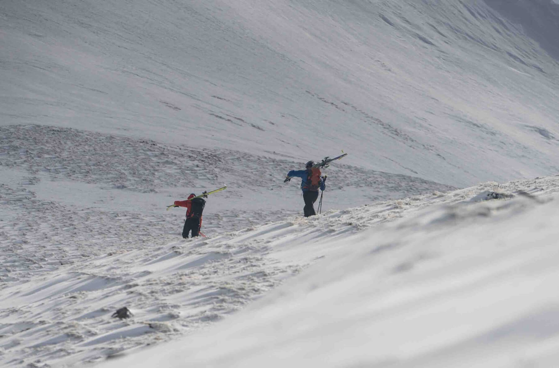 Two skiers after ascending Glas Maol. One new avalanche was spotted in Corrie Fionn, you can just about make out the crown wall.