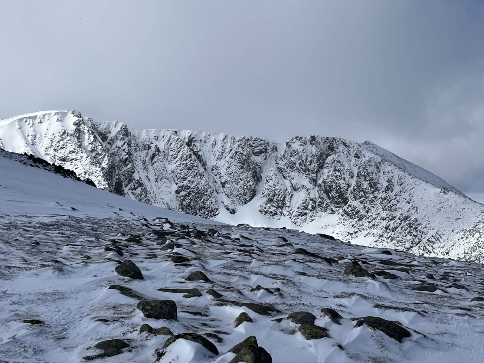 Hard snow-ice on the shoulder leading to the summit of Lochnagar.