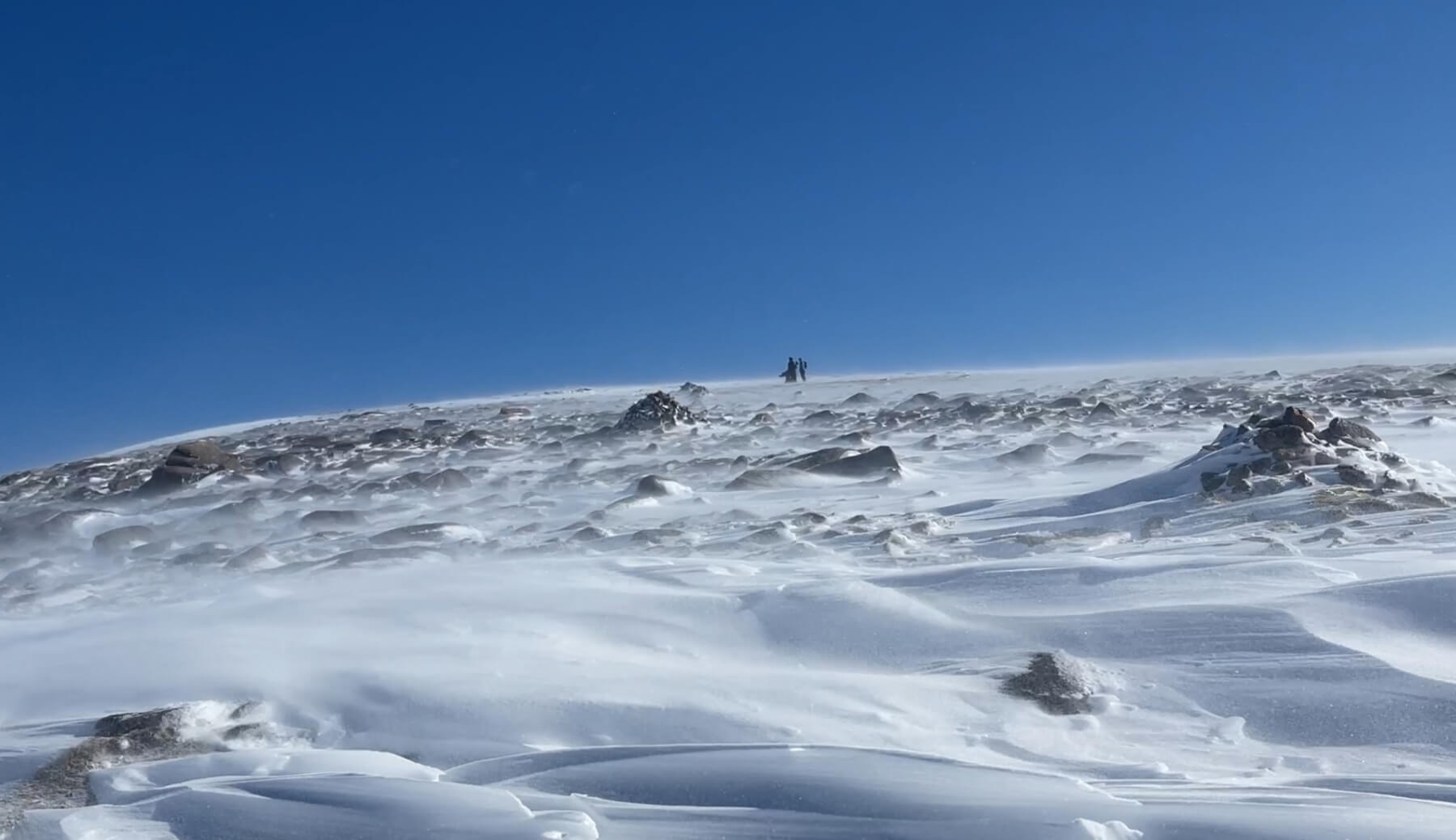 Snow in the foreground drifting right to left. Fuzziness around the walkers in the distance is drifting snow.
