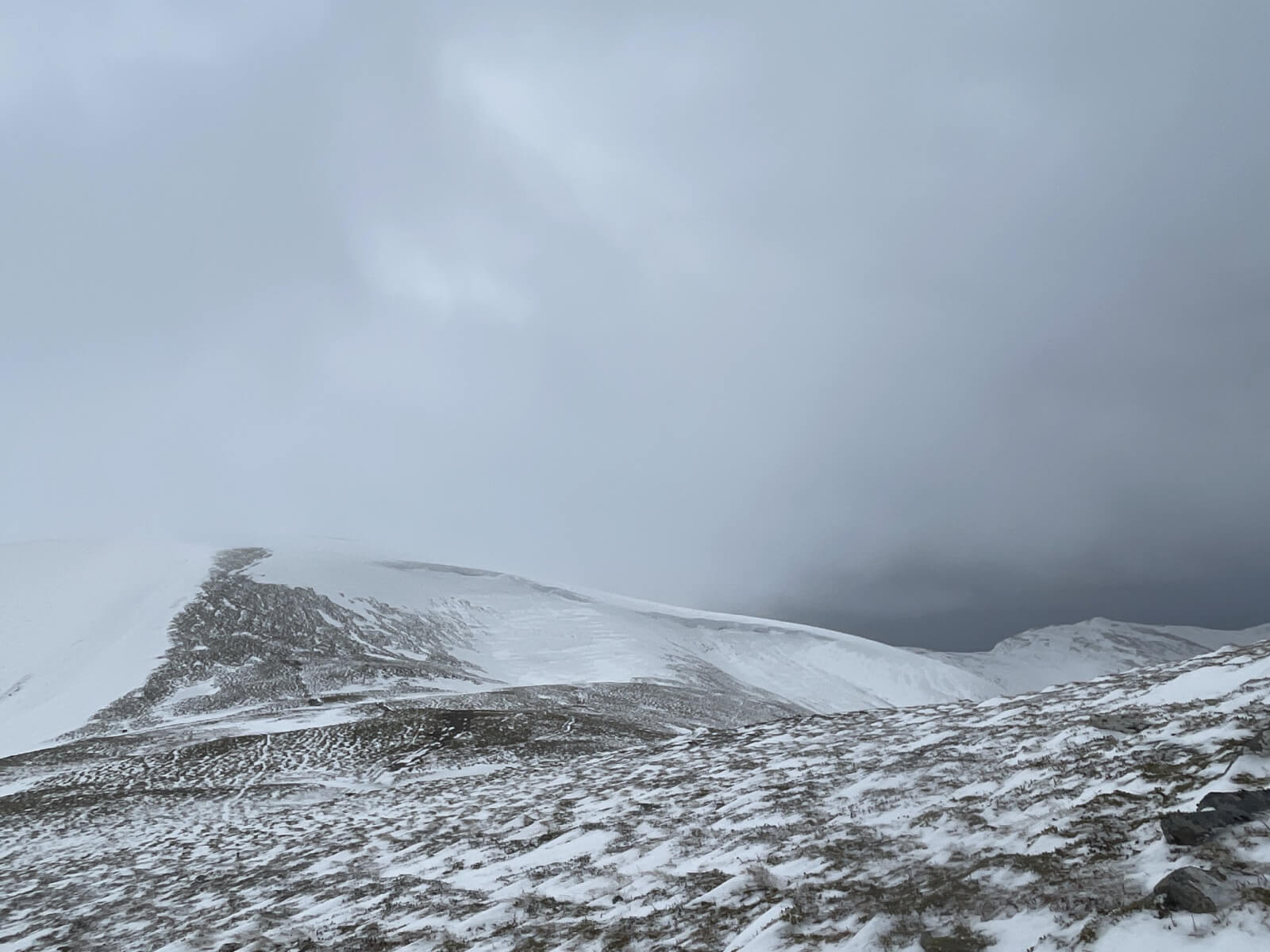 A bit of a windy day with early snowfall turning to showers around late morning. The snowfall was initially settling at 600m with the A93 turning white through the Glenshee Ski Centre. Later a freezing level rise meant that wet snow was falling down to 700 metres only with rain below this altitude. Sheltered locations above 800m were holding onto the drifting snow and knee deep drifts were present in places. The wind was gale force at 900m with progress difficult in exposed locations. The visibility was very poor during the snowfall but as the precipitation cleared to showers some good views were gained. Luckily the cloud cleared just in time for me to watch a small class 1 release take place, with another set of debris apparent a little further away – All useful feedback on the snow stability – High altitude gully tops and sharply defined corrie rims will have been among the most affected locations today. Many locations however have no snow, shallow snow or well scoured, stable snow.