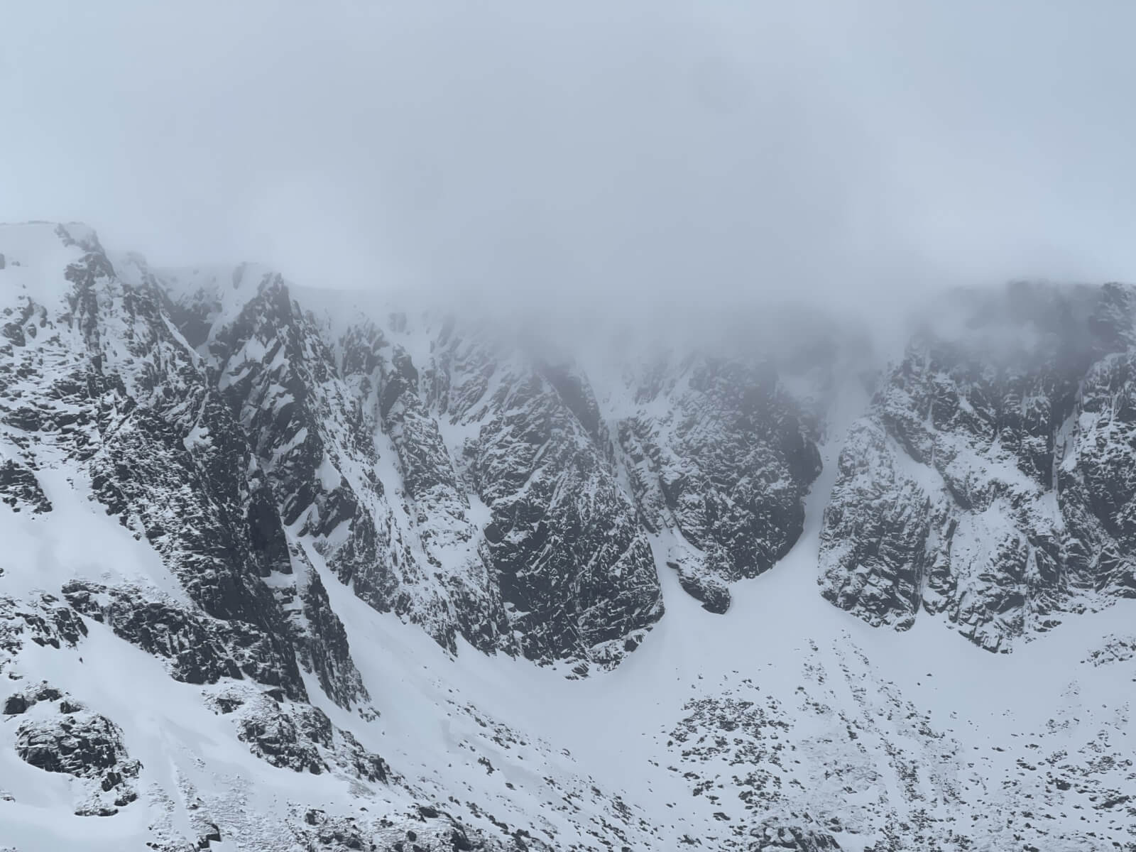 We woke up to fresh snowfall to glen level this morning. Intermittent snow showers continued through the morning and into the afternoon. Although the showers weren’t frequent, they were locally heavy at times. Combined with the gale force winds, conditions felt a bit feisty and it was bitterly cold on exposed skin. I was the only one heading into Lochnagar and was breaking trail in many places. The snow was soft and light so conditions weren’t arduous – mid shin mostly and knee deep in places. Constant drifting taking place at 900m. The new windslab is localised but unstable – failing easily in stability tests. Steeper wind sheltered locations, such as gully tops and sharply defined corrie rims are most affected.