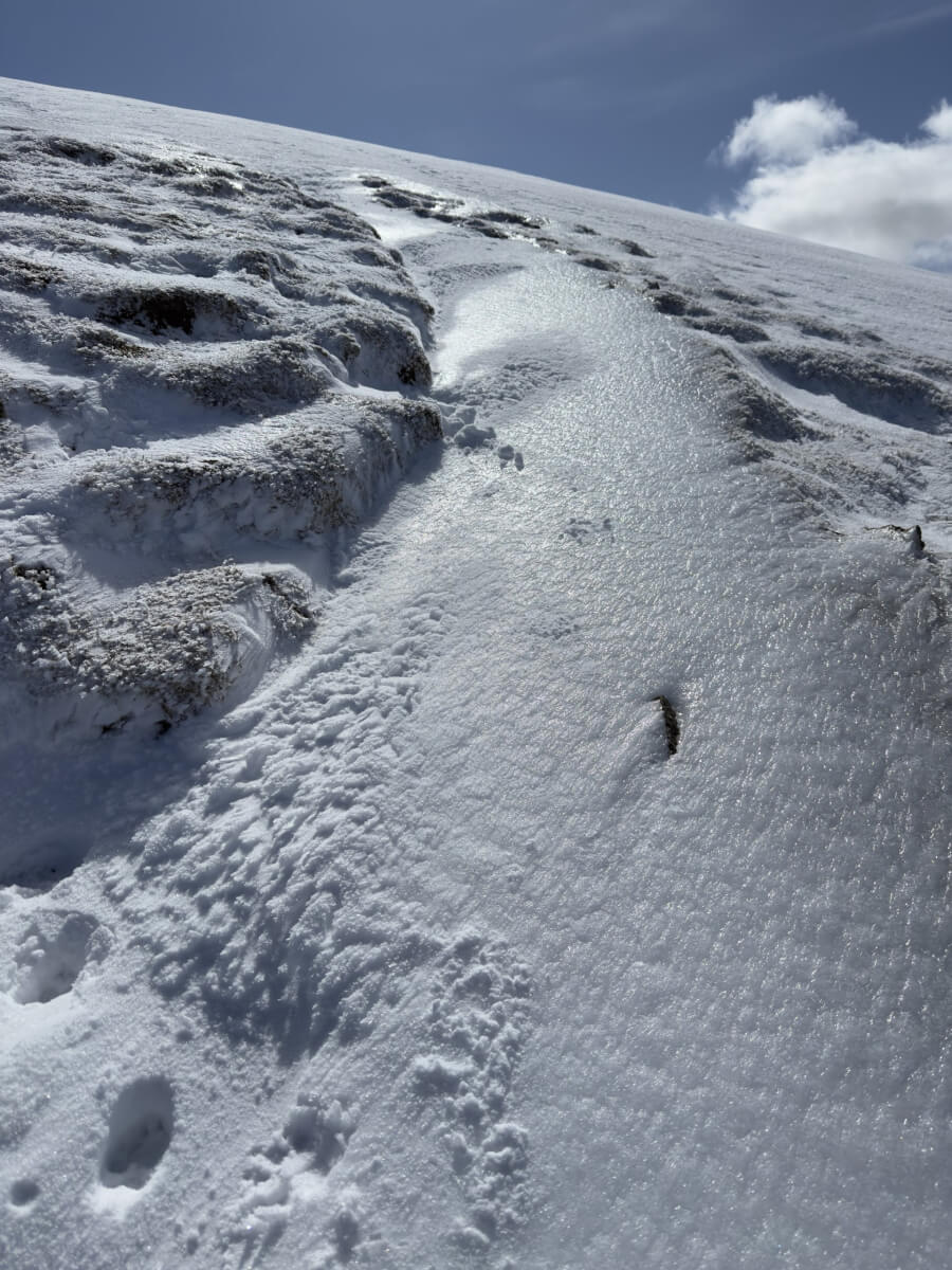 Probably the takeaways from today are – still very much Winter on the hills and the patchy snow is very icy at the moment. Realistically you’ll need either crampons or spikes to get up/down any slope covered in old snow.