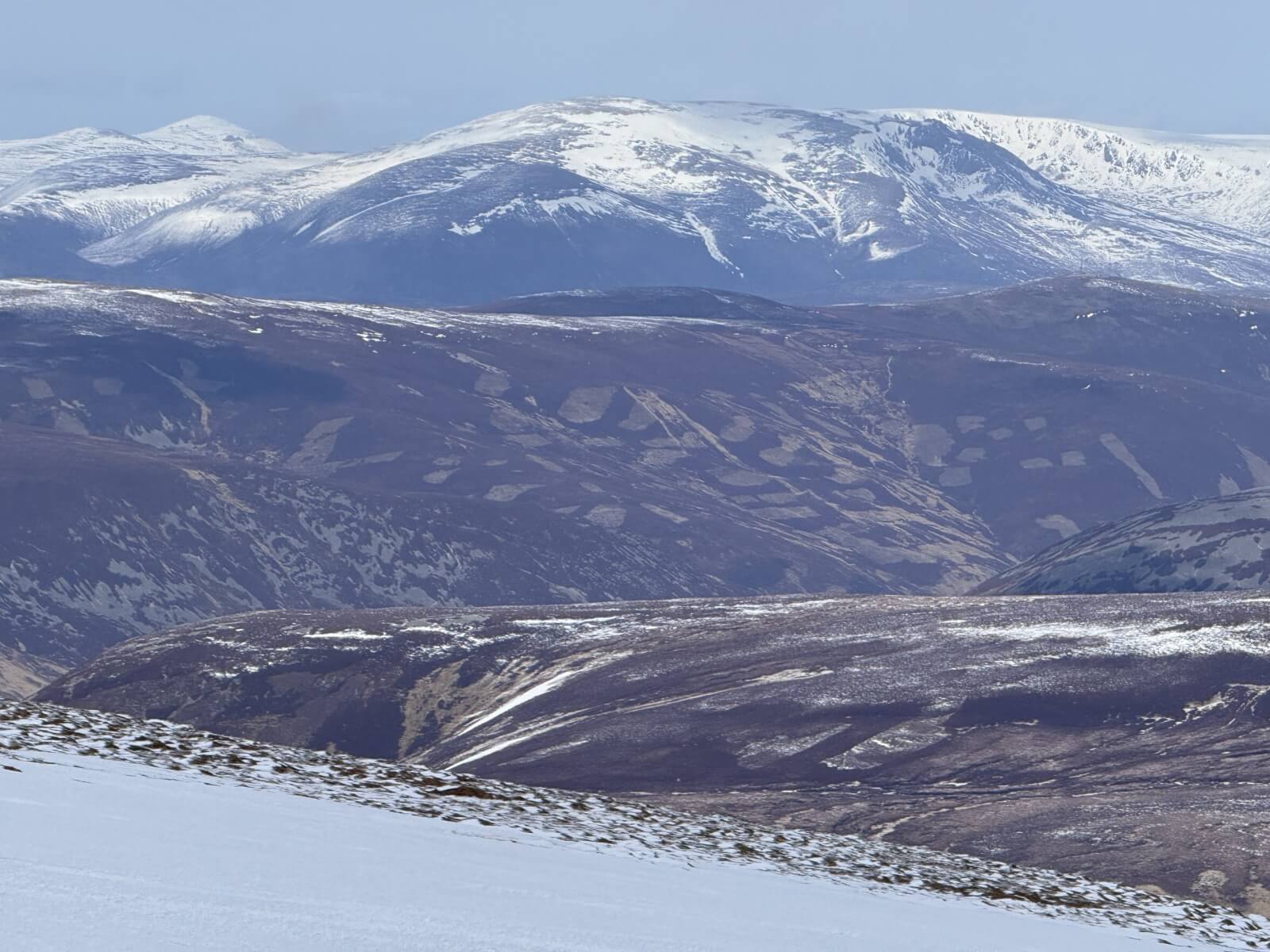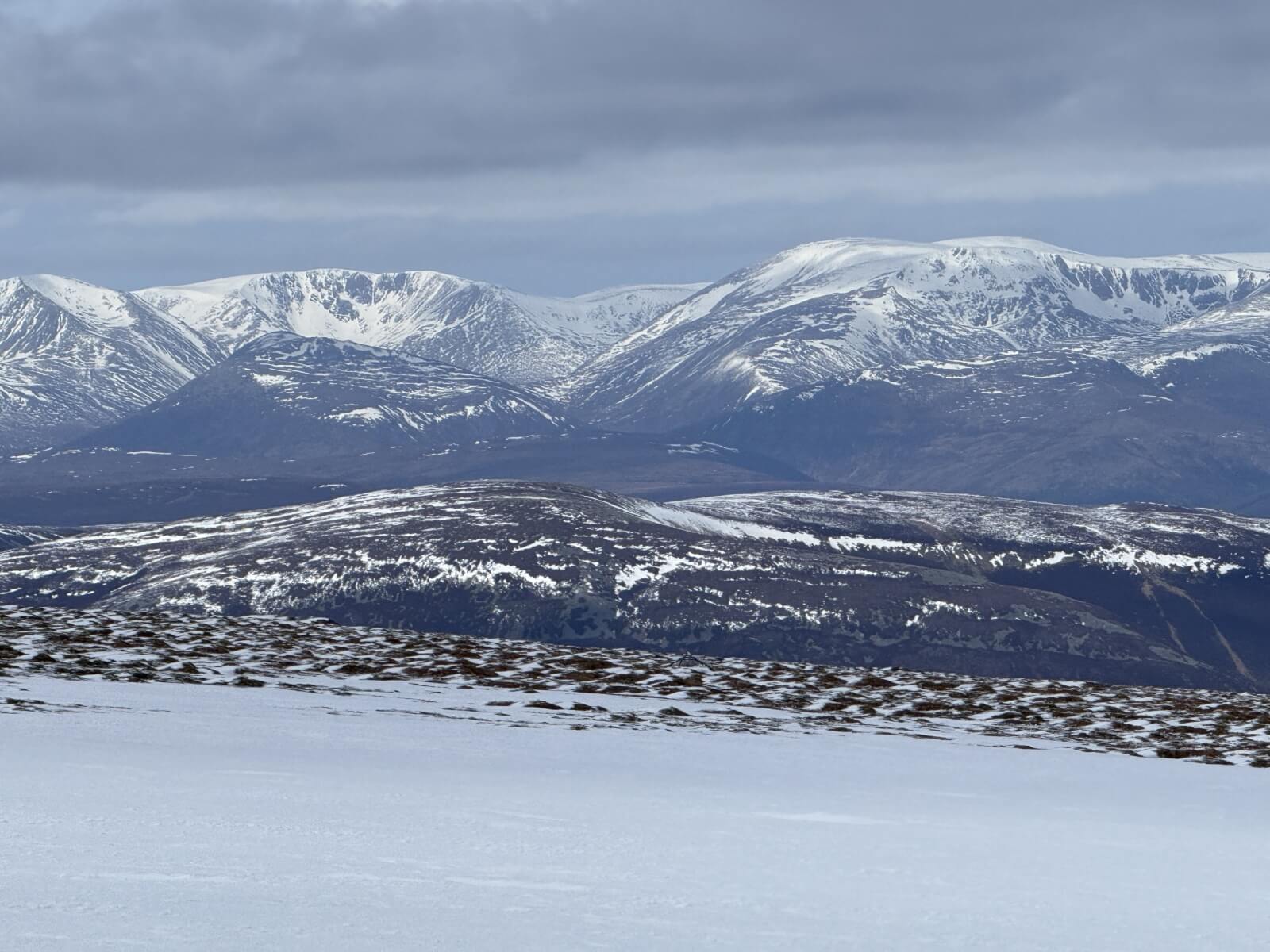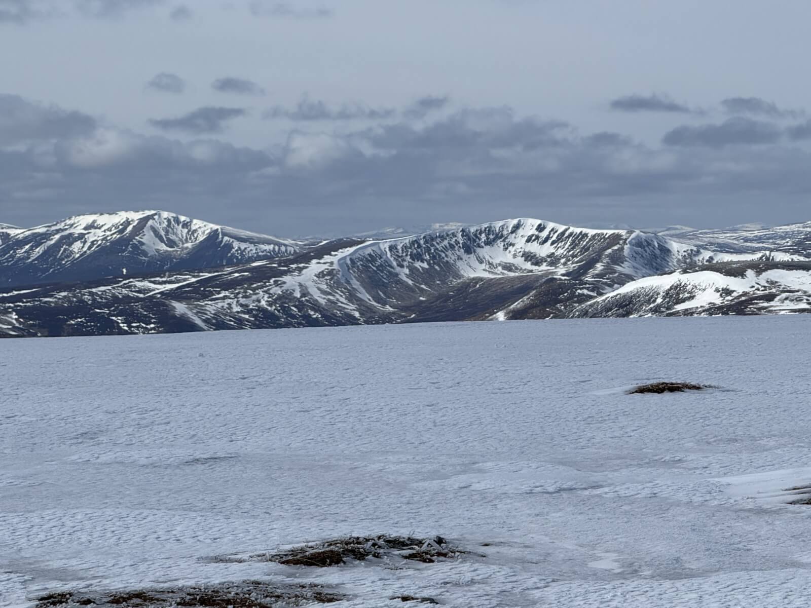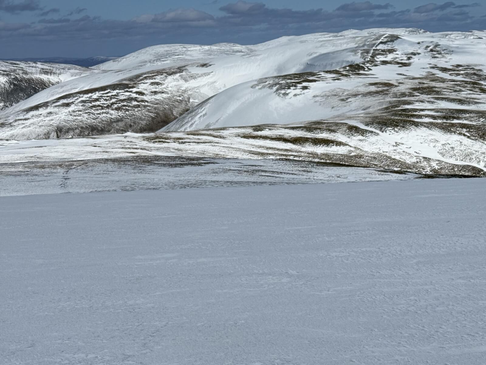 Looking towards Carn an Tuirc and Cairn o Claise. Although there is quite extensive snow patches left unfortunately much of the plateau is broken.